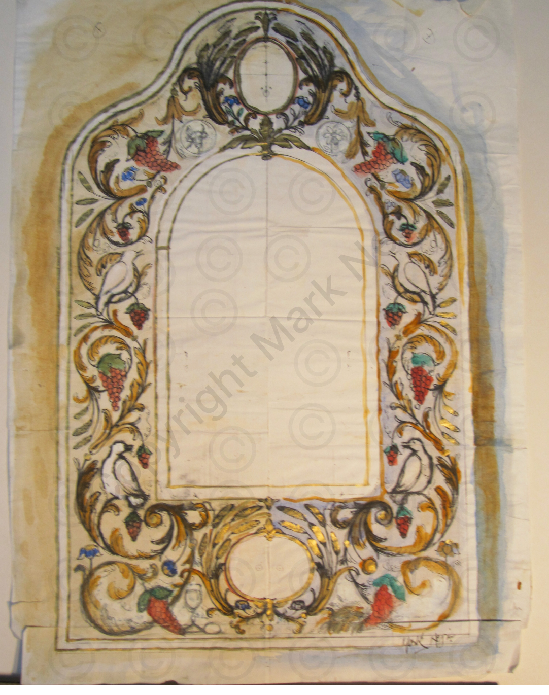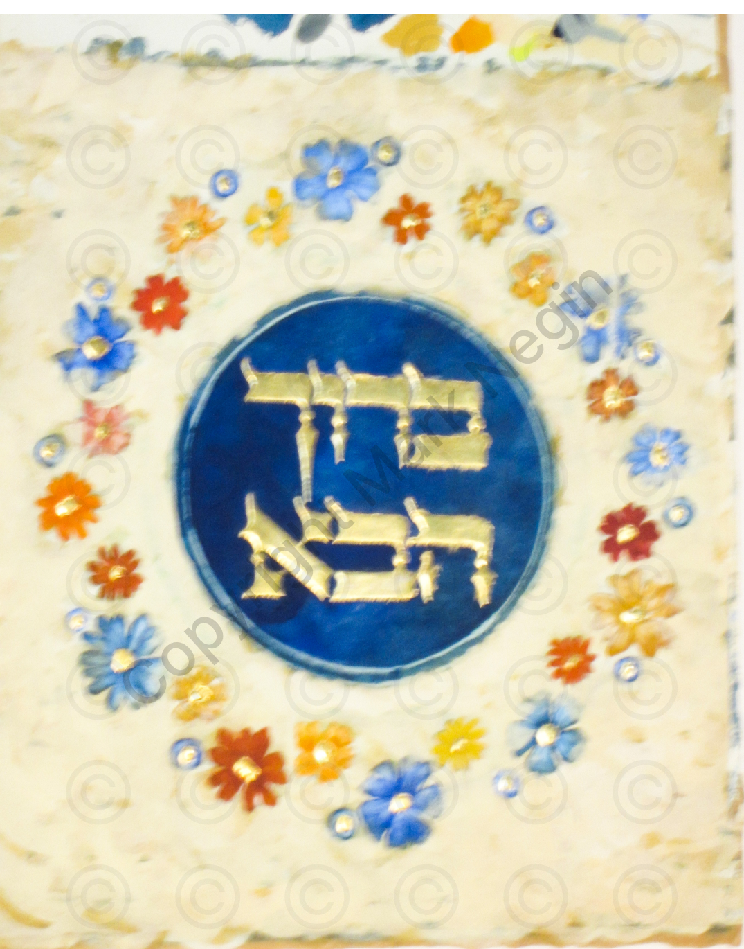 It was after moving to Ramsgate in 1988 that Mark, encouraged by by art collector Marton Braun and John Harthan former Keeper of the V&A Library, author of The History of the Illustrated Book, developed his use of gold leaf on raised gesso to illuminate works on vellum and paper.Much of this work relates to Jewish religious objects most notably the Megillath Esther or Scroll of The Book of Esther, displayed in the 2007 British Library exhibition SACRED. It was also in Ramsgate that Mark began painting murals, especially the Royal Armorials on the south wall of Holy Trinity Church Ramsgate, celebrating the Golden Jubilee of the late Queen Elizabeth II and the Prayer Boards ay the Thanet & District Reform Synagogue.